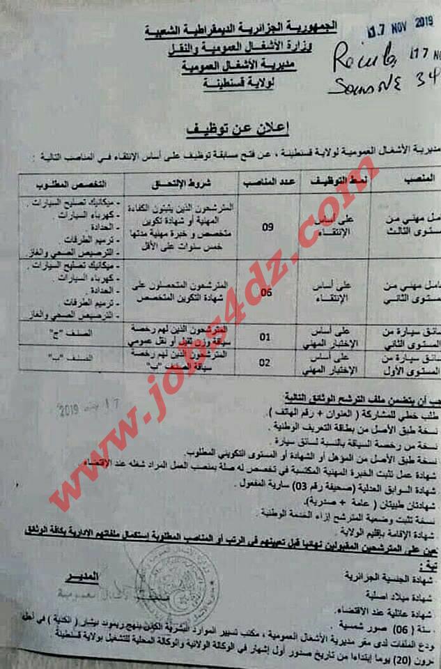 اعلان عن توظيف مديرية الاشغال العمومية لولاية قسنطينة